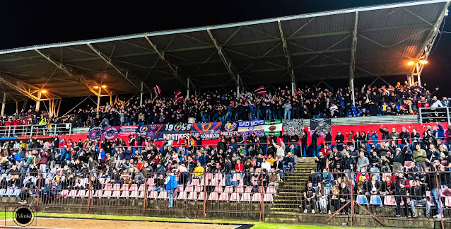 A mérkőzés elején került kihúzásra a nagyobb kiírásunk, mögötte pedig 25-25 kis-, illetve nagyobb lengetős színesítette a látványt. A mérkőzést végig nagy hangerővel, lendülettel szurkoltuk végig, az egyszerűbb pörgősebb rigmusok domináltak. Évek óta kérik tőlünk, hogy vegyük már észre, nem vagyunk ultrák, ami olykor lehetne is jogos, DE NEM TŐLÜK. Lassan harminc éve görcsösen próbálják lemásolni az időszerű európai Ultra trendet, inkább kevesebb, mint több sikerrel. Kívülről is kb. annyira tűntek egységesnek, mint Bosznia. A kiírásaik gyerekesek voltak, biztos az egyik Harry Potter fejű fiataljuk találta ki. A szombati edzéslátogatás megtette a hatását, a játékosok átérezték a mérkőzés súlyát, végig küzdöttek, hajtottak.